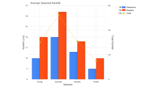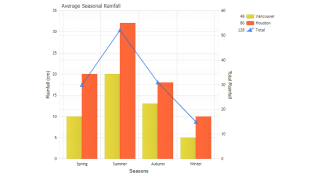 Shows total sales and number of orders from the sample database bound to different axis and also shows how the same chart would appear if bound to the same axis.