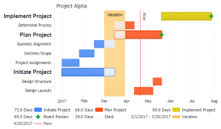 Demonstrates a Gantt chart with JSCharting using unclustered bars, and milestones.